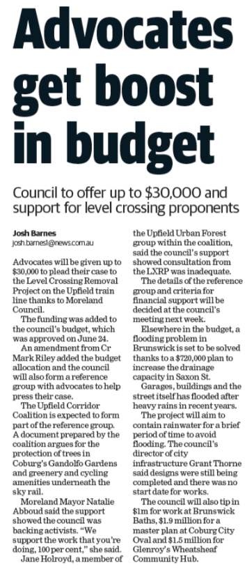 Moreland Council in their budget meeting have allocated $30,000 for community advocacy by community groups as part of level crossing removal. The budget allocation was reported on by the Morelabnd Leader, published 1 July 2017.