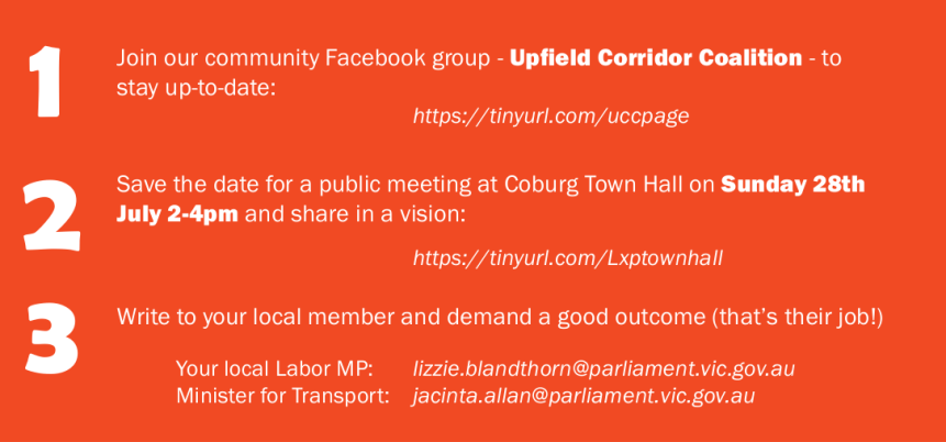 We only have a couple of months make sure Level Crossing Removal Project and Government hear what the Coburg community wants from the level crossing removals. A Town Hall meeting has been organised for Sunday July 28 between 2pm and 4pm at the Coburg Concert Hall in the Coburg Civic centre, 90 Bell Street, Coburg. Note: entrance is from Urquhart street.