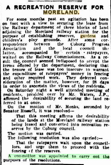 “For some months past an agitation has been on foot with a view to securing the lease from the Railway department of three blocks of land adjoining the Moreland railway station for the purpose of establishing reserves, gardens and children’s play grounds.”