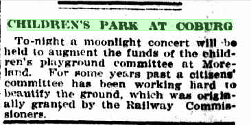 To-night a moonlight concert will be held to augment the funds of the children’s playground committee at Moreland. For some years past a citizens’ committee haa been working hard to beautify the ground, which was originally granted by the Railway Commissioners.