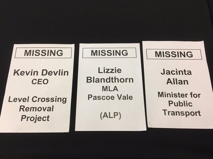 The people who were invited to attend the meeting but who were missing in action were the Level Crossing Removal Project CEO Kevin Devlin, local Pascoe Vale Labor MP Lizzie Blandthorn and state Infrastructure Minister Jacinta Allan.