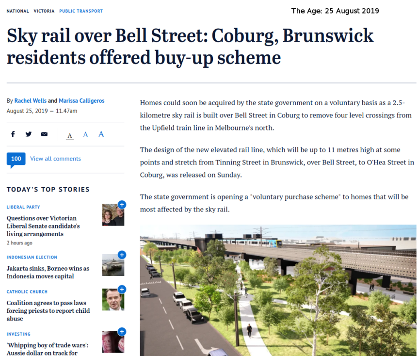 On Sunday August 25 The Age reported on the release of plans for the Bell street to Moreland Road level crossing removal and the offer by the state government to buy out any residents next to the rail line.