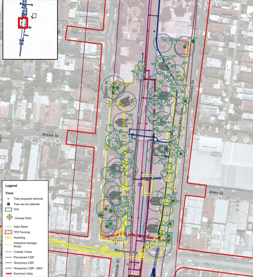 The maps of the area produced by LXRP show 10 hardstand cranes for building the station, resulting in clearfelling all vegetation. Moving the station next to, or over Moreland Road would enable the retention of many of these mature trees. LXRP already are required to work around the Heritage listed Moreland Station building, we think they also need to work around and retain far more trees as part of this project.